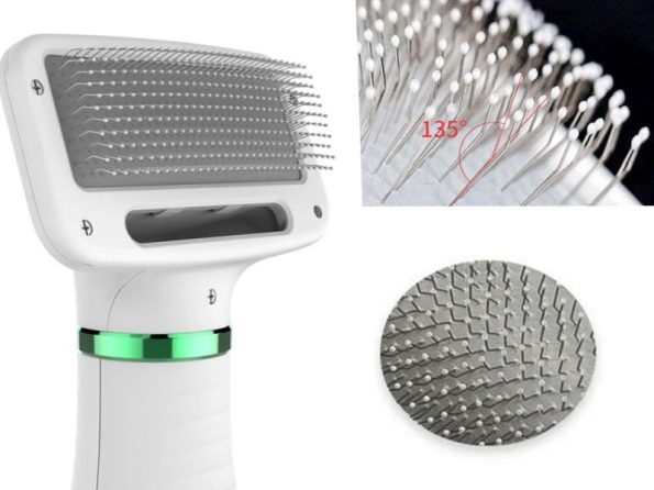Uređaj ima dvije razine sušenja – nižu i višu – što omogućuje prilagodbu protoka zraka i temperature različitim vrstama dlake te osjetljivosti kože. Metalne, tanke, zakrivljene iglice četke zakrivljene su tako da lako prodiru kroz dlaku, uklanjaju zapetljaje i višak poddlake, a istodobno nježno masiraju kožu bez iritacije.