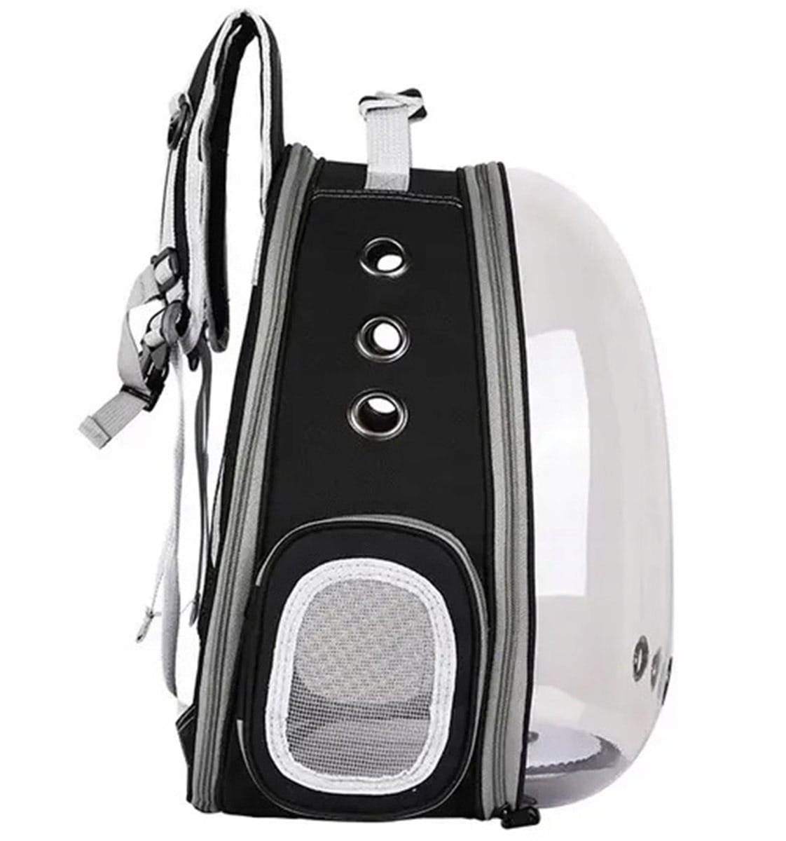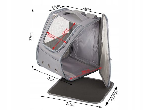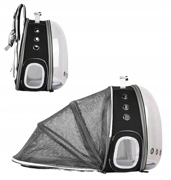 Moderan transporter s prozirnom prednjom stijenkom koja smanjuje stres kod ljubimca. Stražnji dio se može proširiti za više prostora. Ima unutarnji karabiner za sigurnost i bočnu torbicu za bocu.