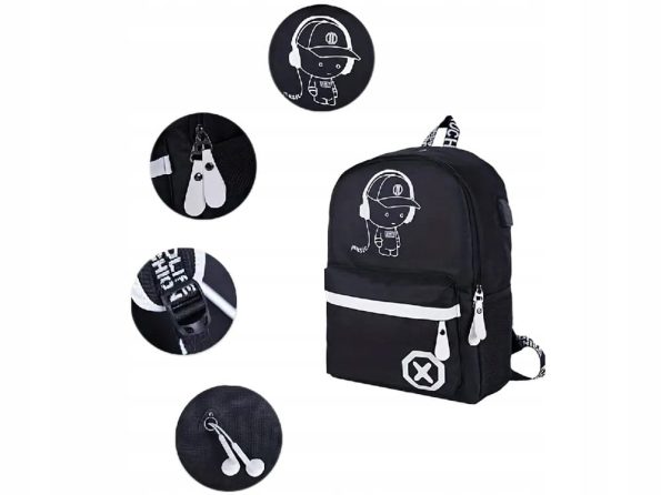 Ruksak ima jednu veliku glavnu pregradu i tri manje unutarnje džepove za organizaciju školskog pribora, gadgeta i sitnica. Na prednjoj strani nalazi se manja pregrada zatvorena patentnim zatvaračem, a sa strana dvije mrežaste pregrade idealne za boce s vodom ili kišobran. USB izlaz i otvor za slušalice omogućuju punjenje telefona i slušanje glazbe u pokretu.